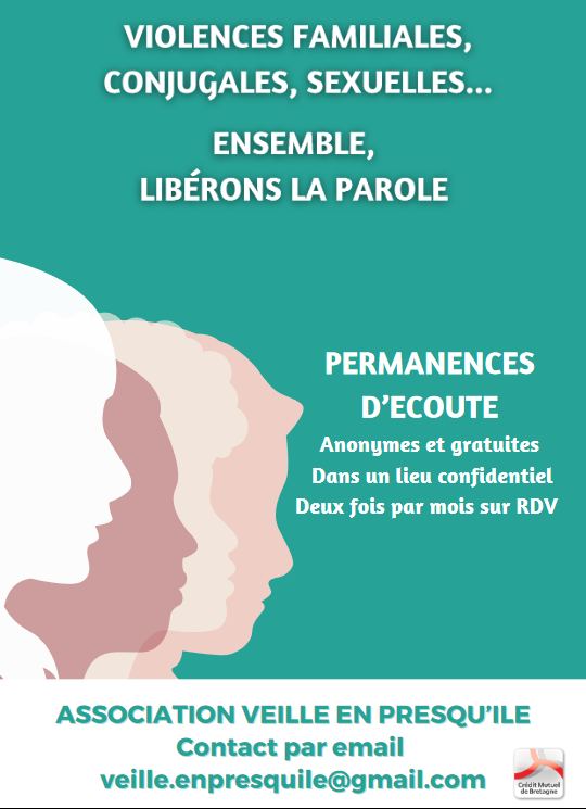 « Veille en Presqu’île , c’est la réunion de 6 professionnelles de l’écoute sensibles à la question des violences intra-familiales.qui mettent leurs compétences, leur énergie et leur temps en commun pour lutter contre les violences conjugales, les violences intra-familiales, les violences sexuelles et sexistes et les violences homophobes.