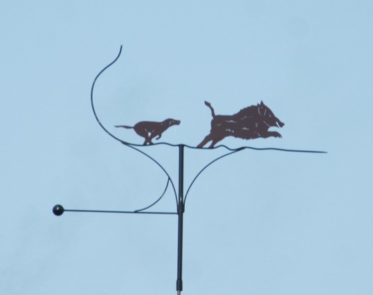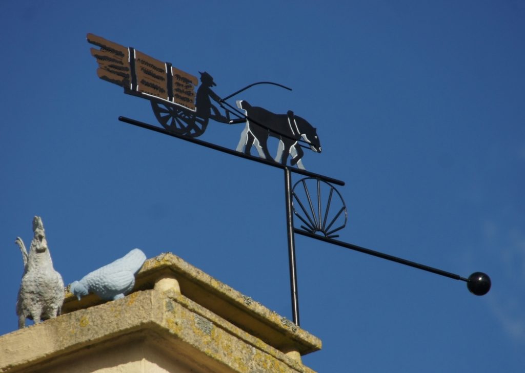 Informations : Cette girouette traditionnelle fait écho à la ruralité de notre territoire. Elle a été simplement achetée dans un magasin de bricolage et offerte au propriétaire à l’occasion d’un anniversaire. A noter que la solidarité entre voisins a permis qu’elle soit repeinte et remise sur son socle pendant la crise sanitaire.