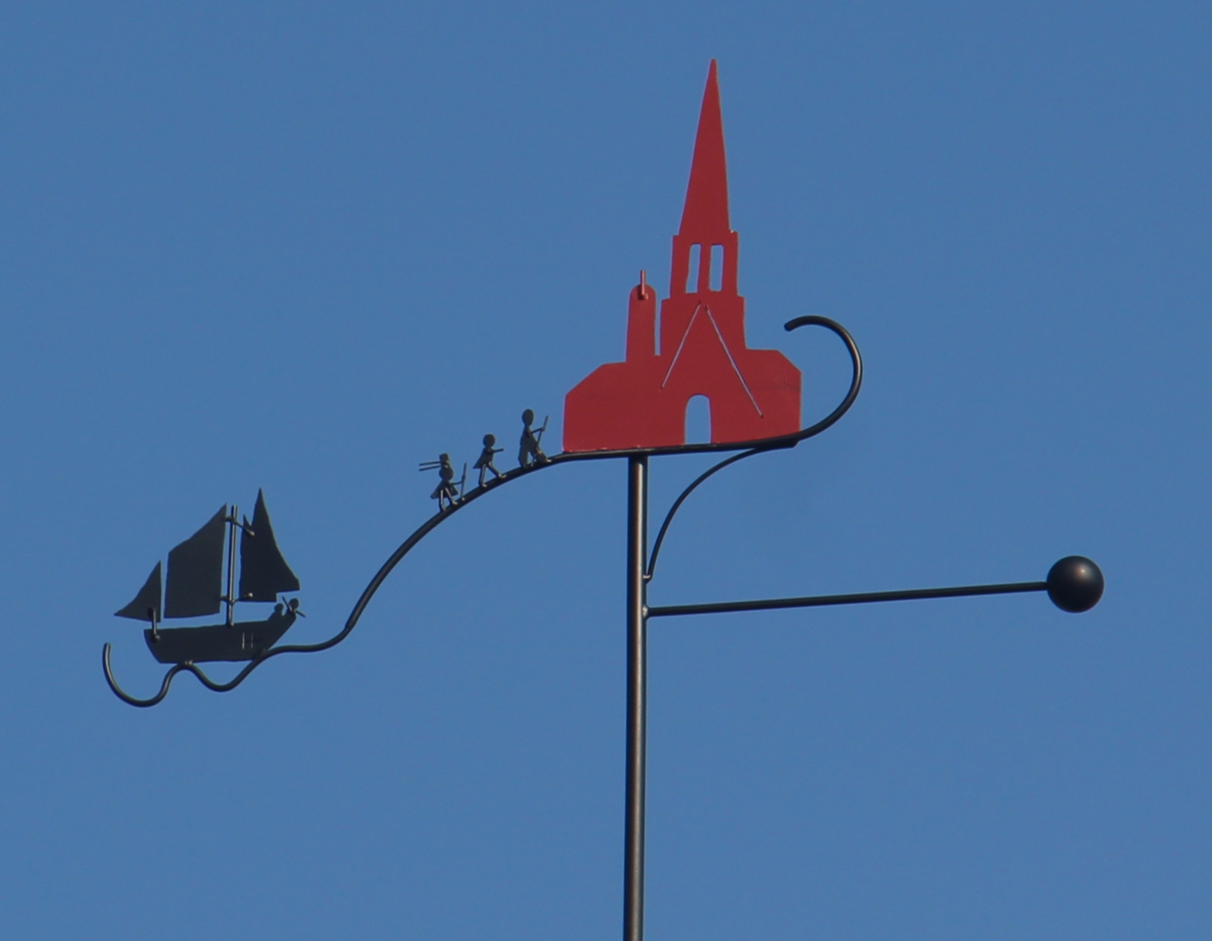 Informations : Après avoir accosté au Faou, trois pèlerins cheminent vers Notre-Dame de Rumengol. La girouette montre cette tradition, au siècle dernier, des habitants de la rade de Brest jusqu’à Douarnenez de venir aux pardons de Rumengol en bateau. A peine débarqués, ils commençaient leur dévotion à la Vierge en marchant vers le Sanctuaire.