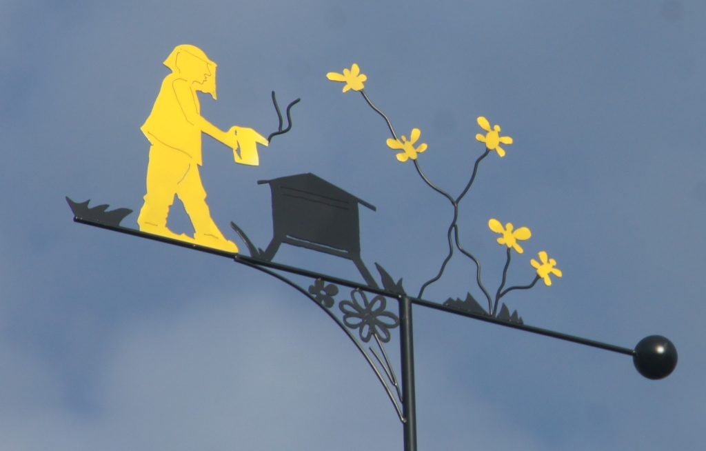 Informations : Cet habitant est apiculteur depuis 1980 et sur Rumengol depuis 1992. Cette girouette rappelle le lien unissant l’homme et les abeilles.