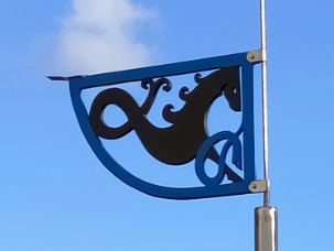 Informations : le cheval marin est un rappel à Morvac’h le cheval du roi légendaire Gradlon (mais aussi de Marc’h) qui aurait déferlé avec la mer sur le Menez Hom lors de l’immersion de la ville d’Ys. C’est de là haut que son ami St Guénolé aurait décidé de convertir le site païen du Faou et de Rumengol…